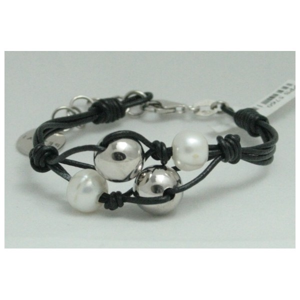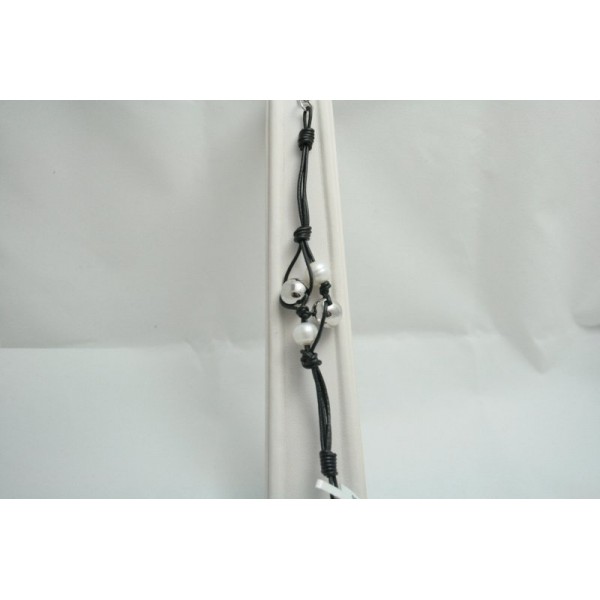 Pulsera de cuero negro con 2 bolas de plata de 1ª Ley de 925 mls., con baño de rodio y 2 perlas cultivadas.