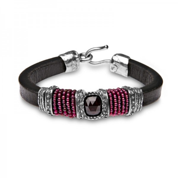 Pulsera PLATA DE PALO de cuero marrón, con motivos de plata de 1ª Ley, granate facetado engastado en el centro y con hilo de granates pequeños a ambos lados.