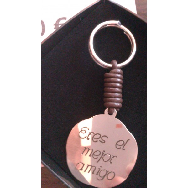 Llavero realizado en nuestro taller, en plata de 1ª Ley 925 mls.y cuero. Se puede personalizar con el grabado.